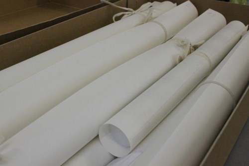 Non-woven polyester (like Tyveck®) is also a good choice for larger items. It is strong and chemically inert and you can buy it by the sheet, the roll or the "sleeve" – a ready-made tube which is supplied in long rolls to be cut to size. You can use a sewing machine to make up bags, or wrap and tie like a parcel. We have been trying to phase out our large cardboard tubes (as seen on the right) for better quality materials and a more space efficient solution. These really big maps are stored horizontally on shelves.
