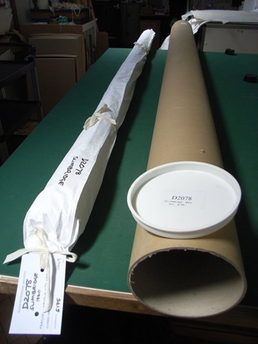 Another option for lighter, smaller items is to roll them round a rigid core (with a reasonable diameter, don’t roll things too tightly!). We have used a light-weight, chemically stable foam as a core for this collection of brass rubbings on thin paper. It is long enough to extend beyond the ends of the original item. The rolled item is then covered by an archival paper wrapper. Archival quality tie-on labels can be used to identify them, or you can write directly on the wrapper. These are stored together in a long box on a shelf.