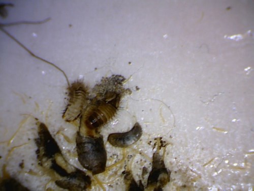 This picture shows "Woolly Bears" (larvae of the carpet beetle) eating a silverfish carcass.