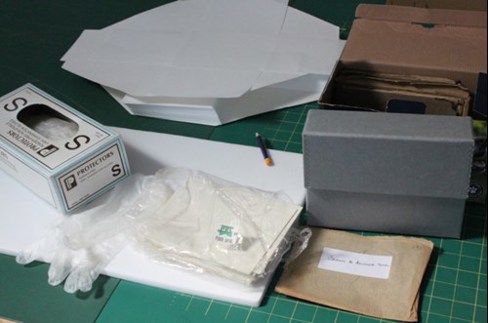 Remember the glass plate negatives in the dog food box? We re-housed them in paper four-flap enclosures (the white ones at the top of the picture) and then inside photo storage envelopes. Two protective enclosures around each glass plate means we can avoid touching the surface of the photograph when getting them out for people to see. Think in terms of taking the enclosure from the item rather than the other way round (more on handling techniques later). All four flaps of the inner enclosure can be opened to allow inspection over a light box avoiding the need to remove the plate entirely or handle it directly.