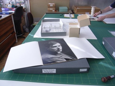 In the foreground, you can see one of the larger photographs from the collection that was too big for the ring-binder box. These we protected with paper folders and support boards that we made to measure from photo-safe materials, and housed in "clamshell" or "drop-spine" boxes of the nearest size (different names are used for the same type of thing by different suppliers).