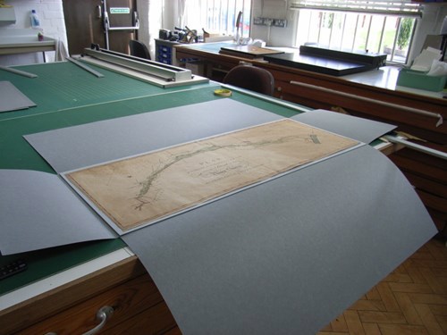 Here is a large plan, too big for our largest box. We have made a four-flap folder for it and included a support board made from archival corrugated board which is rigid and light. The plan can now be handled safely and viewed easily. It can be stored safely in a plan chest or on a shelf.